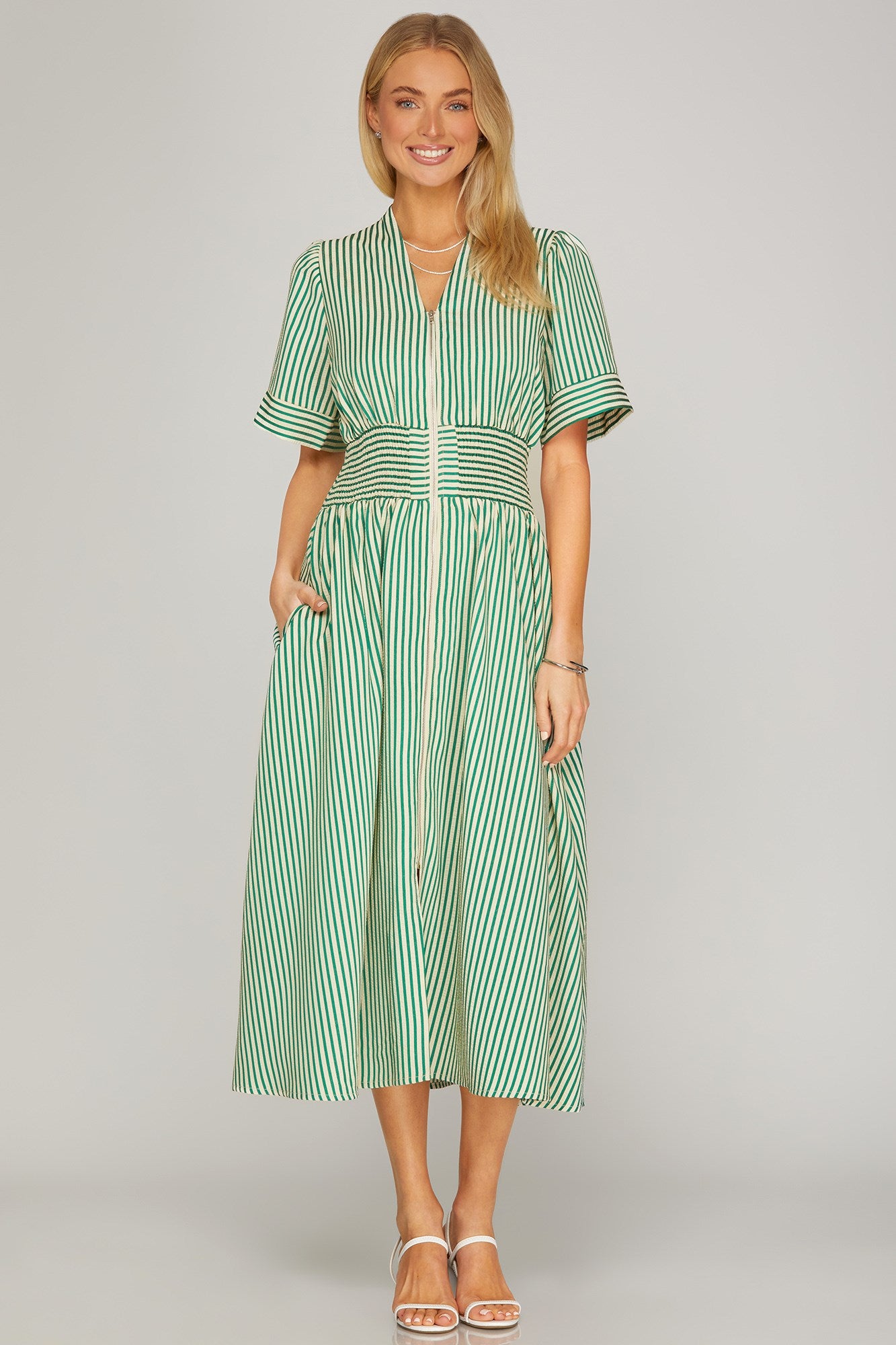 Effortless elegance meets warm-weather comfort in this charming midi dress. The smocked waist creates a flattering silhouette while the front zip allows for easy styling adjustments. Delicate striped detailing adds visual interest, and short sleeves keep you cool during spring and summer occasions. Perfect for brunches, garden parties, or casual outings where you want to look polished without trying too hard.
