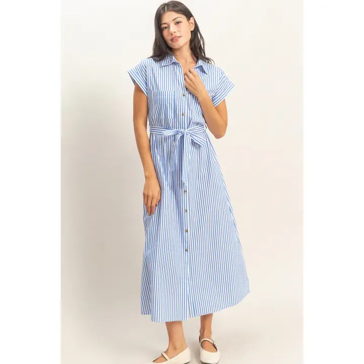 Effortless elegance meets summer style with this striped poplin belted shirt dress. Crafted from lightweight material, it's designed to keep you cool and comfortable during warm-weather adventures. The sharp spread collar neckline adds a polished touch, while the tie waist creates a flattering silhouette you can adjust to your preference. Perfect for beach getaways, casual outings, or seaside dinners—this versatile piece transitions seamlessly from day to night. The classic striped pattern and structured poplin fabric ensure you'll look put-together without sacrificing breathability. An essential wardrobe staple for anyone who loves relaxed sophistication.