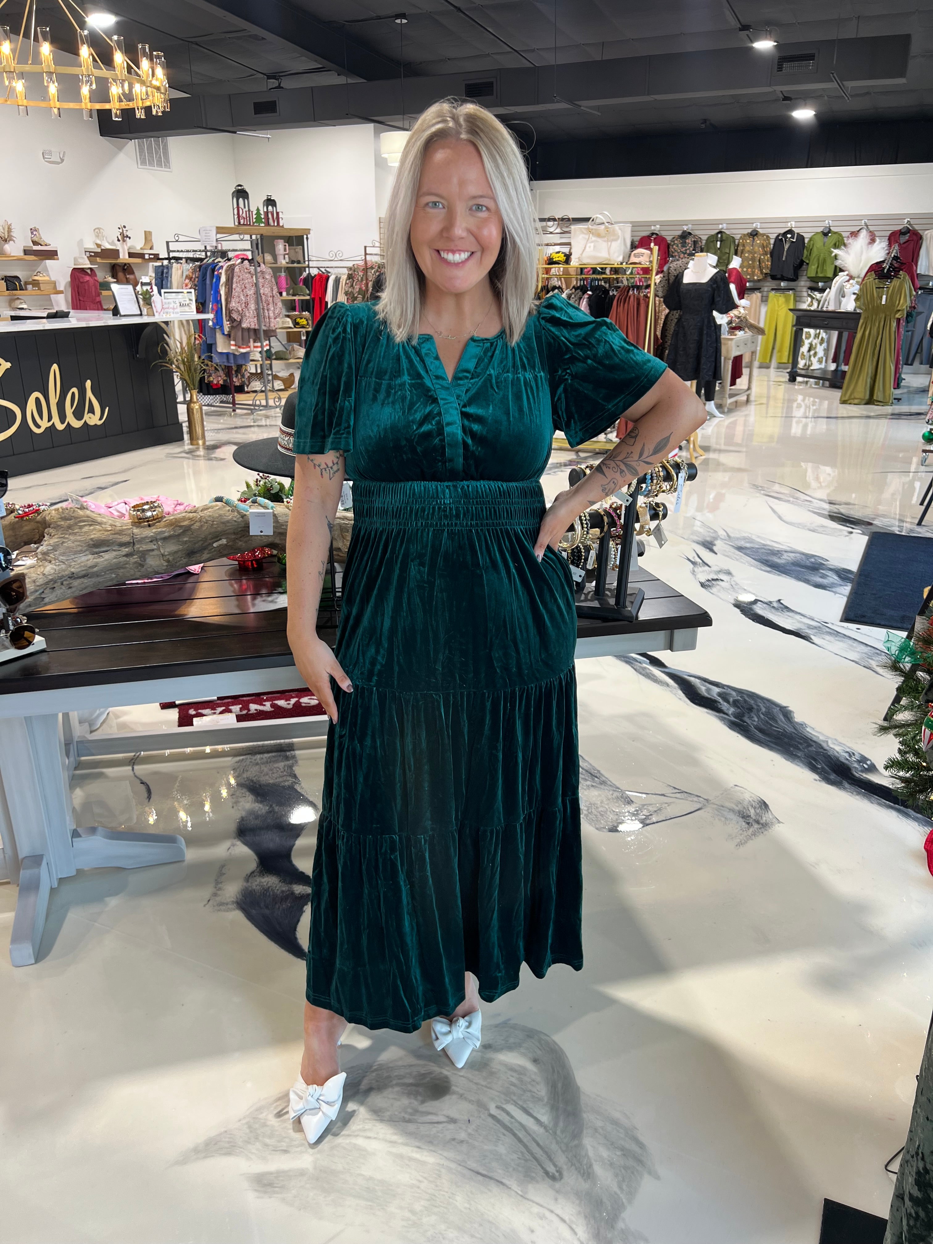 Chic tiered design maxi dress with a boho inspired look. Dress is maxi length and features a v neckline. Fit is true to size.