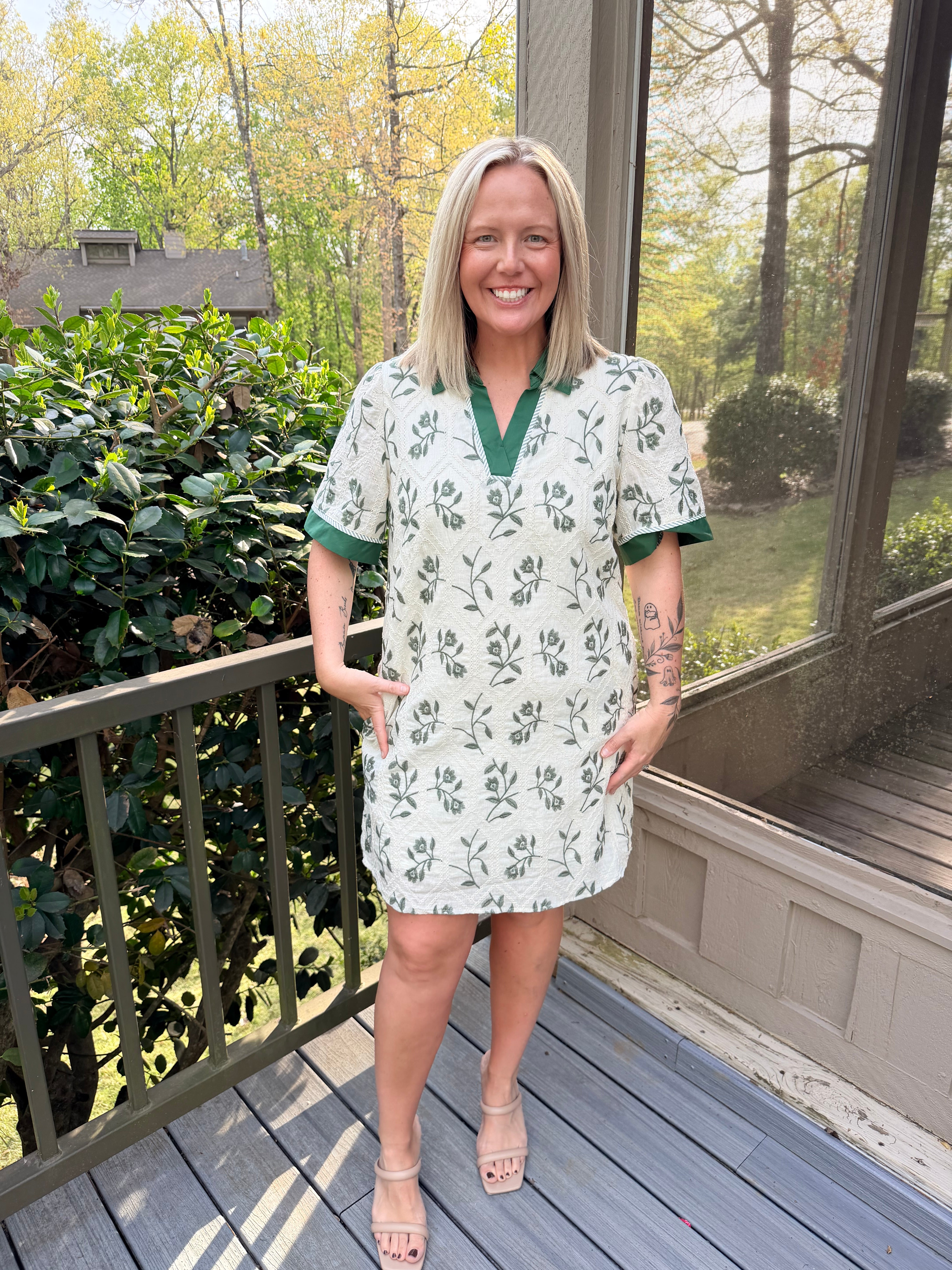 Effortless spring style meets everyday comfort in this charming mini dress. Crafted from soft woven fabric, it features delicate embroidery detailing that adds a touch of sophistication. The classic collared neckline and short sleeves create a polished look, while functional front pockets keep your essentials close. Cut to true size for a relaxed, flattering fit that moves with you. Perfect for casual outings, weekend brunches, or layering into your seasonal wardrobe.