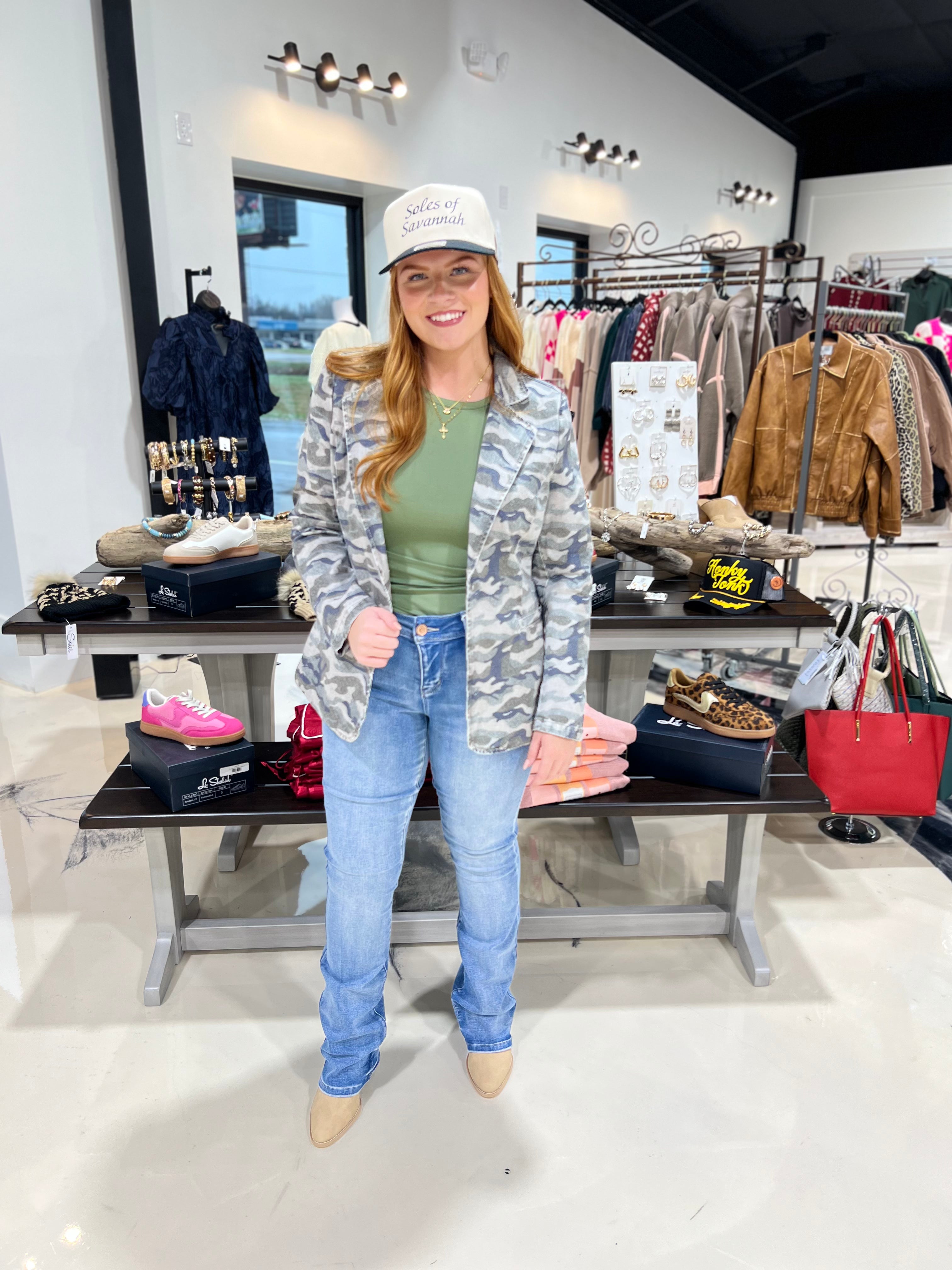 Elevate your everyday style with our Chic Camo Blazer—where edge meets elegance. This printed button-down blazer features a bold camouflage pattern that breaks up neutrals while staying versatile enough for the office or weekend adventures. Tailored structure keeps you polished, while the relaxed fit ensures all-day comfort. Layer it over basics or dress it up for an instant style upgrade that says you're fashion-forward and fun.
