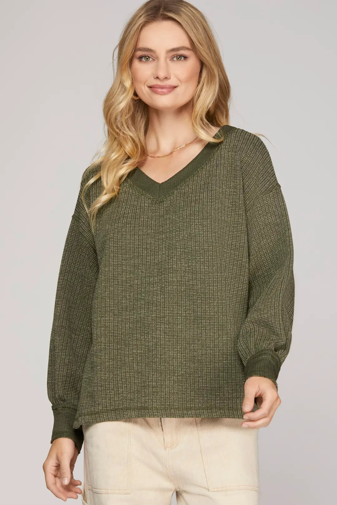 Wrap yourself in cozy vibes with this Feeling Olive Waffle Knit Top. The washed waffle knit fabric delivers that perfect lived-in softness, while the long bubble sleeves add a playful twist to your everyday wardrobe. Whether you're layering up or going solo, this versatile olive shade pairs effortlessly with everything. Pure comfort meets style in one irresistible piece.
