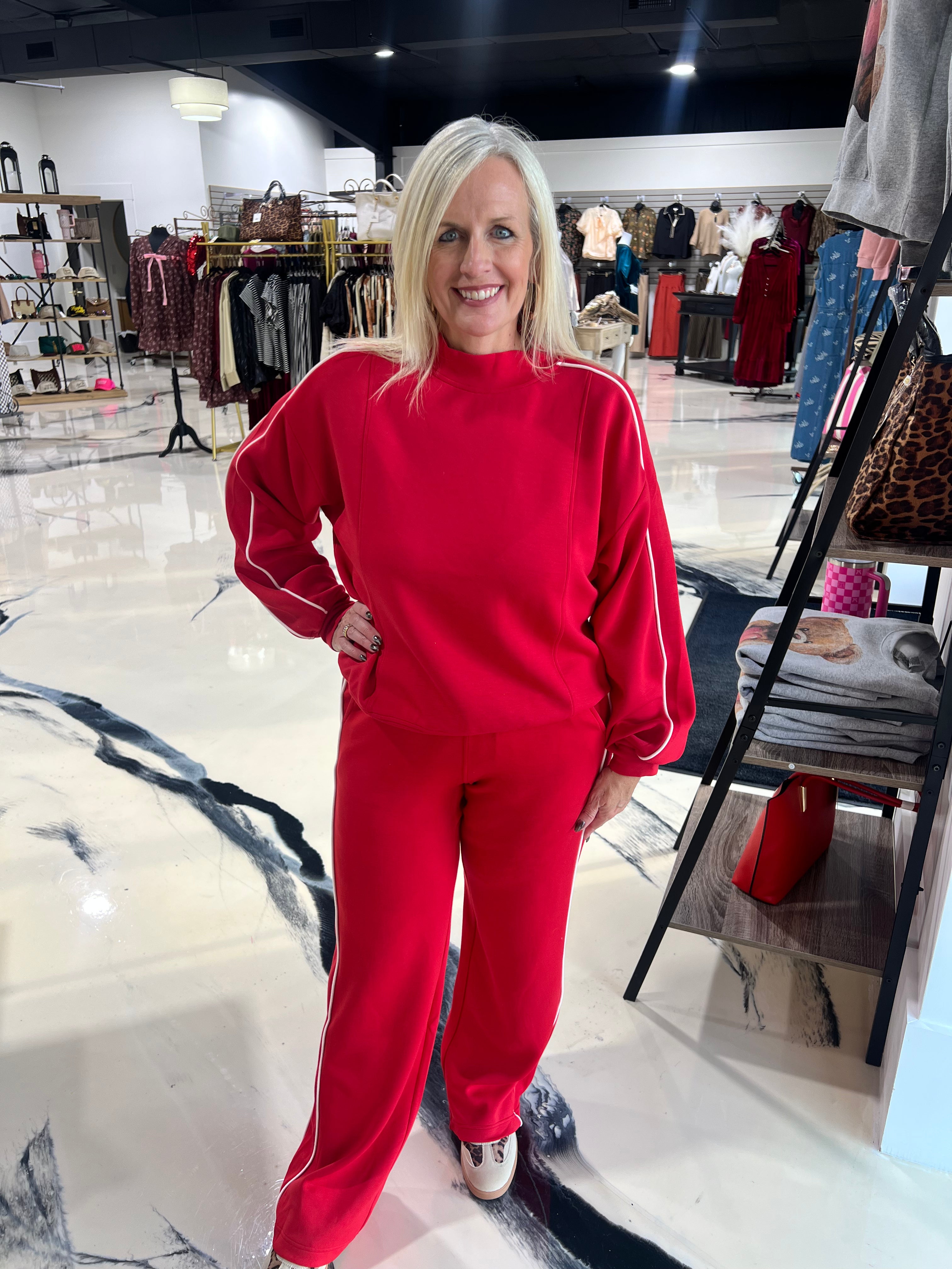 Straight-leg comfort meets cheeky attitude. These modal poly piping pants deliver a sleek silhouette with just the right amount of sass. The smooth modal fabric feels buttery soft against your skin, while contrasting piping details add visual interest and edge. Perfect for anyone who's mastered the art of looking put-together while feeling completely at ease. Slip them on and own every room you walk into.