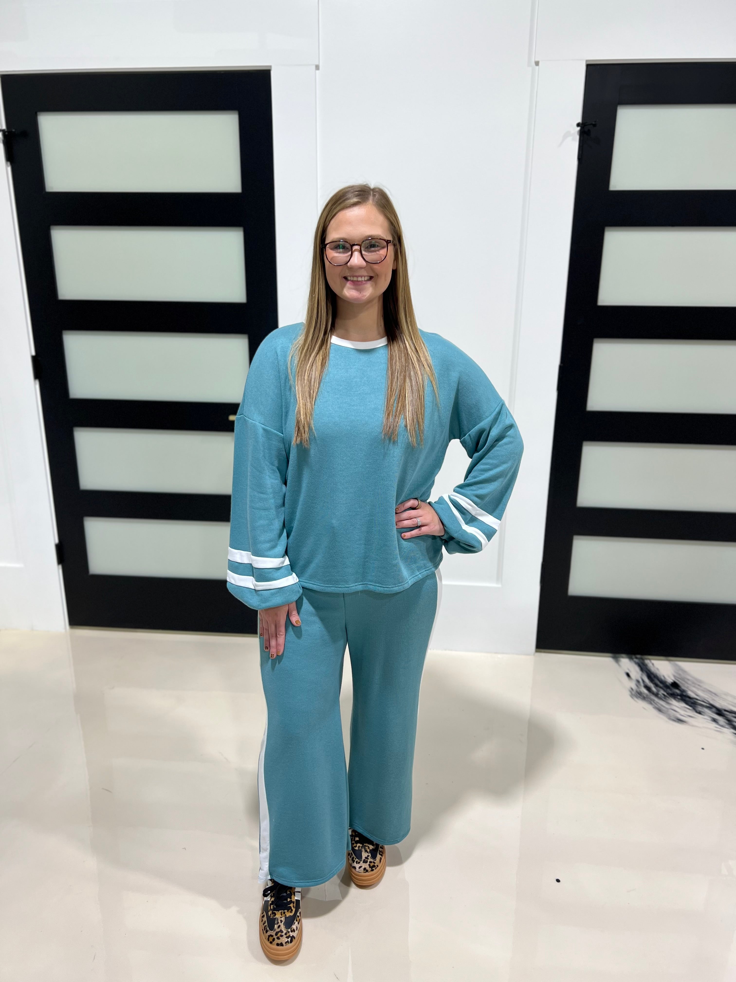 Experience effortless style and comfort with the My Way To Go Set in Teal. Crafted from lightweight French terry, this matching pant set offers breathable softness ideal for all-day wear. The sleek contrast band along the sides adds a refined, sporty touch, enhancing the silhouette while providing subtle visual interest. Perfect for casual outings or relaxed weekends, this set combines expert tailoring with premium fabric for a versatile wardrobe staple.