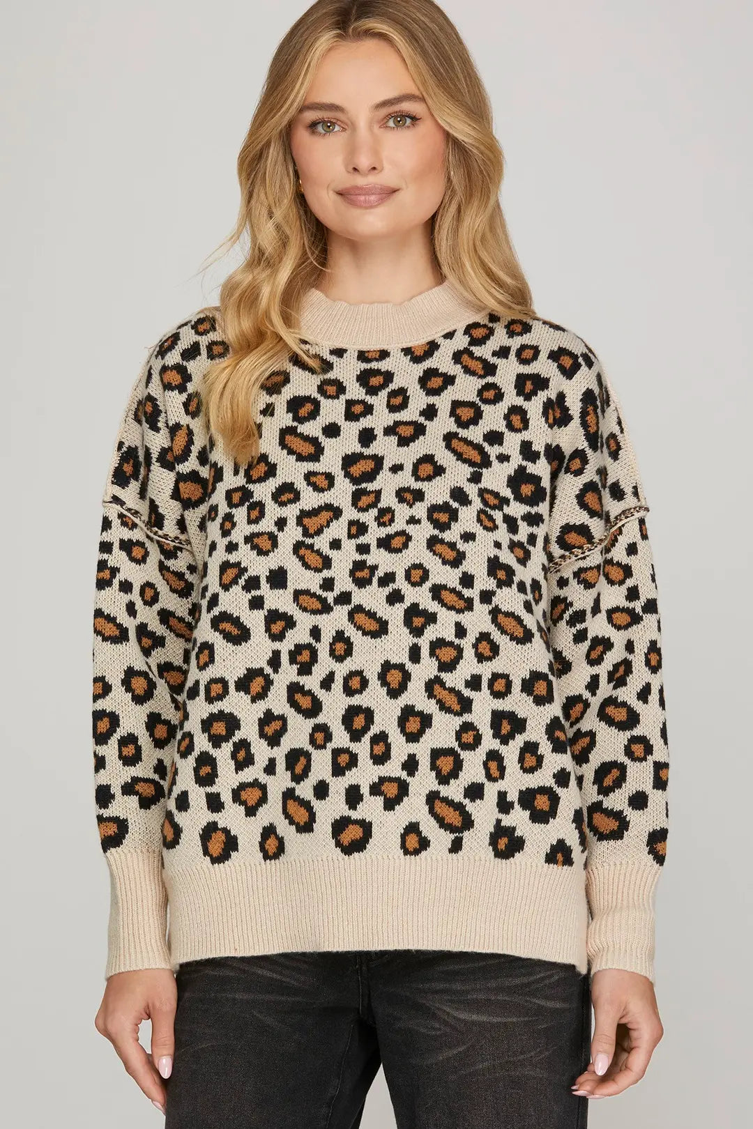This long sleeve leopard print sweater is perfect for the cooler months! Pair with jeans or dress it down with leggings for the perfect fall outfit. True to size fit.