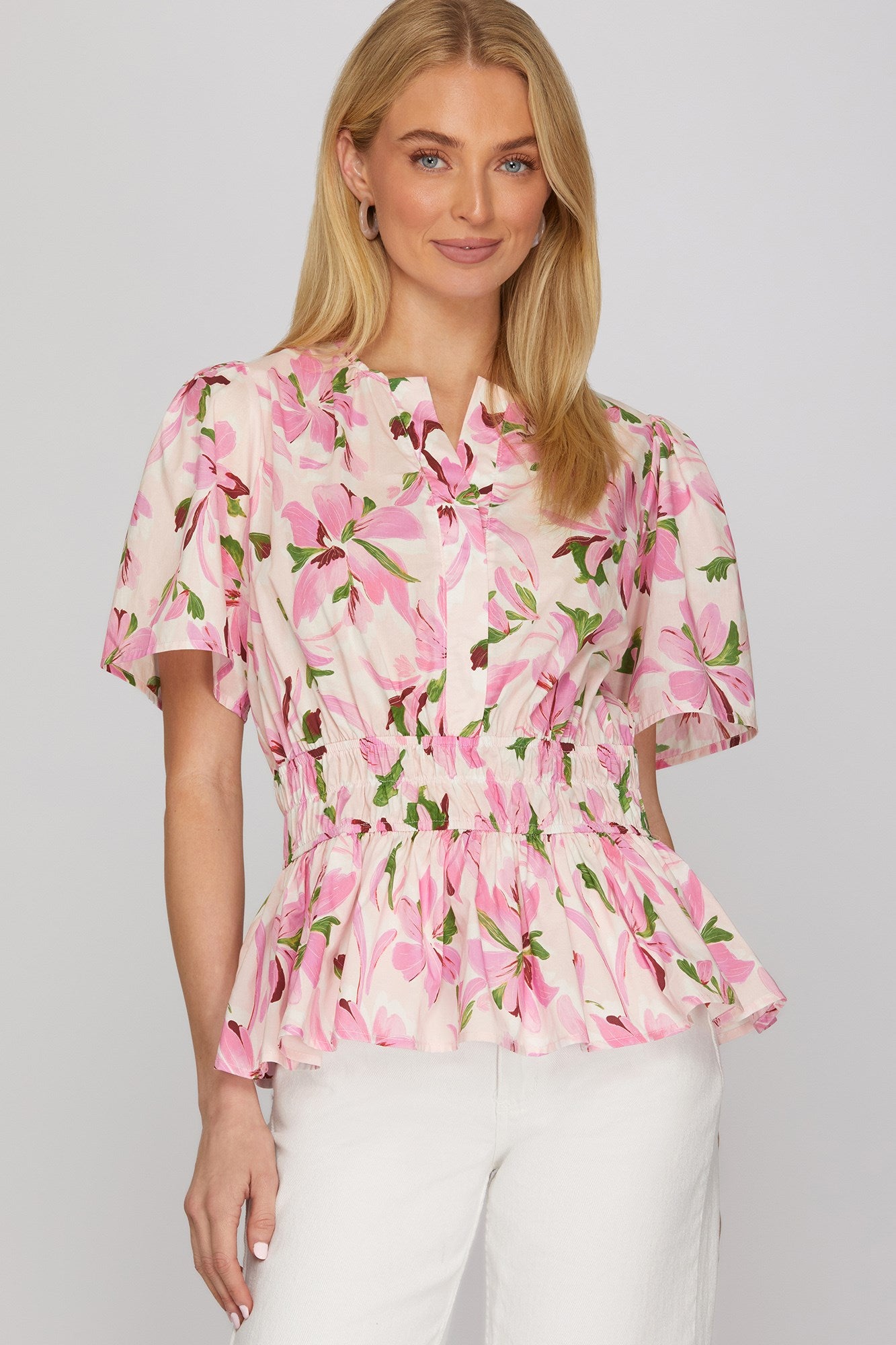 Elevate your spring wardrobe with The Katie Floral Top in pink. This charming half-sleeve woven peplum top features a delicate floral design that brings fresh, feminine style to any occasion. The structured peplum silhouette flatters your figure while the breathable woven fabric keeps you comfortable through warm weather. Fit is true to size.