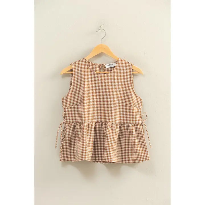 Effortless summer style meets playful design with this gingham sleeveless peplum top. The lightweight fabric keeps you cool while the flattering peplum silhouette and adjustable side ties create a feminine, tailored fit. Perfect paired with denim shorts for a casual day look or jeans for versatile everyday wear. Whether you're heading to the beach or running errands around town, this brown gingham top is your go-to piece for warm-weather comfort and charm.