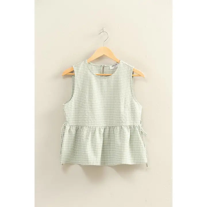 Effortless style meets seasonal charm with this lightweight peplum sleeveless top. The classic gingham print brings a fresh, playful touch that pairs beautifully with denim shorts or jeans for an instantly polished look. Perfect for spring and summer days, this versatile piece transitions seamlessly from casual outings to weekend adventures. The flattering peplum silhouette adds dimension and movement, while the sleeveless design keeps you cool and comfortable. A wardrobe essential that works as hard as you do.
